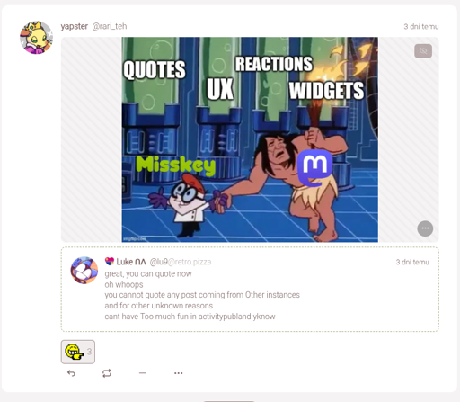 arrow-up1737arrow-down1imageLemmy walked so PieFed could runplus-squarequokk.auSatyrSack@quokk.auEnglish · 9 days agomessage-square341linkfedilink