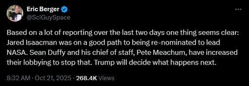 arrow-up117arrow-down1image[Berger] Lobbying has increased against Isaacman's re-nomination for NASA adminplus-squaresh.itjust.worksthreelonmusketeers@sh.itjust.worksMEnglish · 6 days agomessage-square0linkfedilink