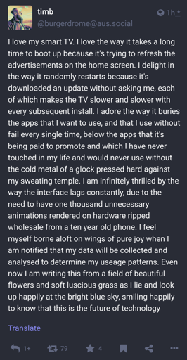 Have a regular PC hooked up to the TV. That’s my smart machine. I control every aspect of it. Fuck Smart TVs.