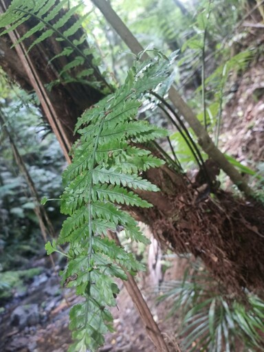 A tree fern called a ponga (Alsophila tricolor) forms the base, growing on this tree ferns trunk is a hen and chicken fern (Asplenium bulbiferum).