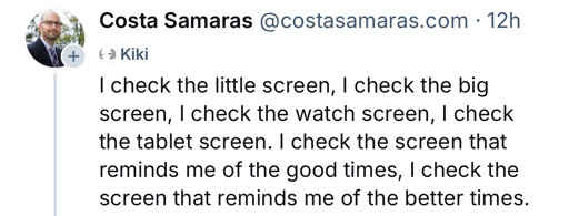 Alt: a bluesky post from @costasamaras.com that says, “I check the little screen, I check the big screen, I check the watch screen, I check the tablet screen. I check the screen that reminds me of the good times, I check the screen that reminds me of the better times.”