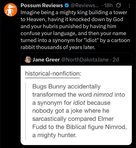 I remember being so confused by why the X-Men villain was named Nimrod when I was a kid. I always assumed it was ironic or something but never really got it. Then as an adult I learned about the biblical Nimrod and was like…“oh”. I wonder what if would have been like if I hadn’t been exposed to Looney Tunes first.