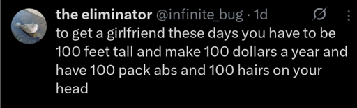 If you write messages to other men about how unreasonable women’s dating expectations are and its mostly relating to common male insecurities, there’s a pretty good chance you’re incel posting or parodying an incel.