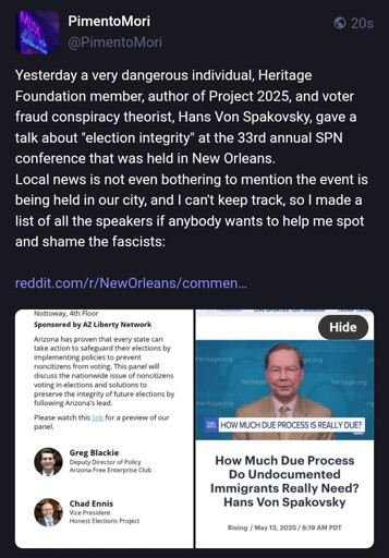 Lemmy links with the actual speakers list if you prefer not to deal with Reddit at all: Complete lists of speakers at the 33rd annual State Policy Network meeting in New Orleans Pt 1/4