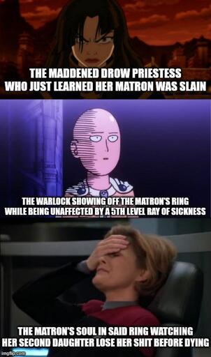 We’re at the tail end of the Drow civil war, and in order to reach the upper district, we had to teleport into a Drow household, which required me to be wearing a Drow matron’s ring, which among other things still contains her soul. She does not like us, does not like the daughter we worked with to see her dead, and would take over my body (Or try to) if I attuned it.