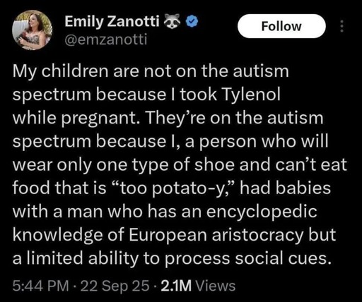 Clearly she was talking fistfuls of Tylenol while she was pregnant, behind your back. /s