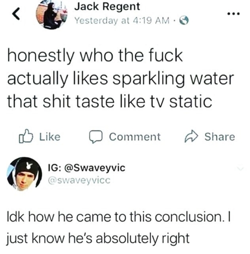 Sparkling water doesn’t just taste like water with bubbles in it. It has a weird chemical taste on top of everything else which there’s some reason people seem to ignore.