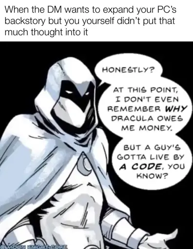 Stamets@lemmy.dbzer0.com to RPGMemes @ttrpg.network · 20 days agoBackstory problemslemmy.dbzer0.comimagemessage-square9linkfedilinkarrow-up1384arrow-down13