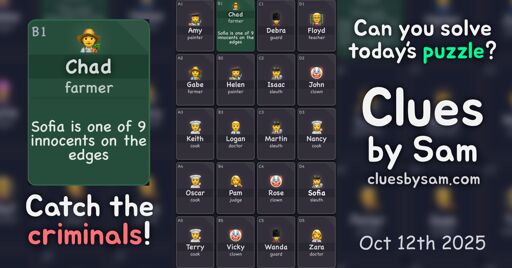 arrow-up12arrow-down1external-linkClues by Sam (Oct 10th 2025)cluesbysam.comSamdell@lemmy.eco.br to dailygames@lemmy.zip · 3 days agomessage-square2linkfedilinkfile-textcross-posted to: dailygames@lemmy.zipdailygames@lemmy.zipdailygames@lemmy.zipdailygames@lemmy.zipdailygames@lemmy.zipdailygames@lemmy.zipdailygames@lemmy.zipdailygames@lemmy.zipdailygames@lemmy.zip