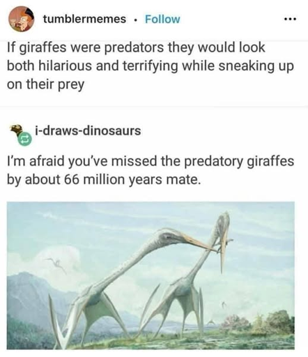 fossilesque@mander.xyzM to Science Memes@mander.xyzEnglish · 2 months agopredatory giraffesmander.xyzimagemessage-square36linkfedilinkarrow-up1628arrow-down12