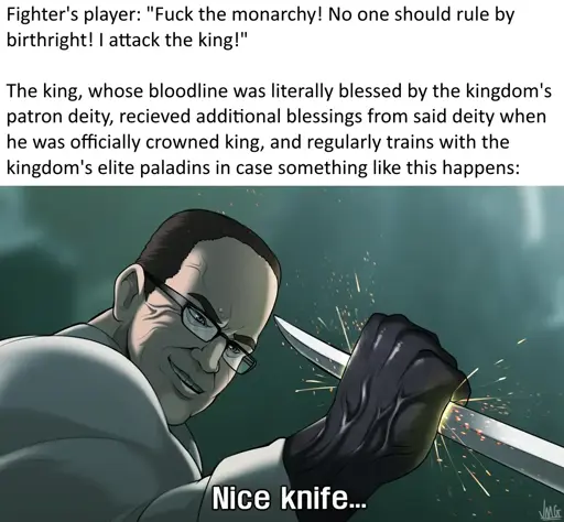 If this king doesn’t have access to wizards casting every defensive spell in the player’s handbook on him every single day of his life, wearing the best magical armor in the world that glamors into ordinary royal attire, with defensive wards cast around his immediate vicinity every day, and he just let adventurers stroll into his castle armed while he was being lax with all these precautions, then he deserves to get Kirked.