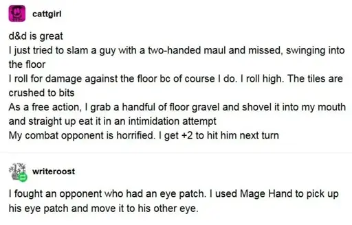Stamets@lemmy.dbzer0.com to RPGMemes @ttrpg.network · 18 days agoPossibilities are endlesslemmy.dbzer0.comimagemessage-square81linkfedilinkarrow-up1822arrow-down17