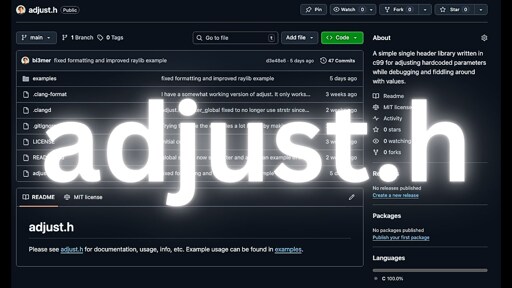 Works with any C99 compiler and integrates perfectly with Raylib, ImGui, and other popular libraries. Whether you’re tweaking game physics, adjusting graphics parameters, or fine-tuning algorithms, adjust.h will make your life simpler. Zero dependencies, minimal setup, maximum productivity.