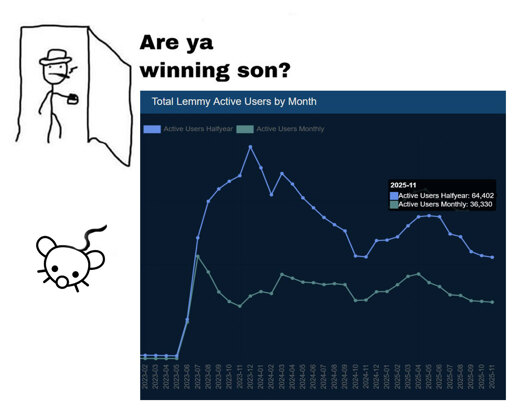 Anecdotally, it doesn’t feel like the experience is contracting, or part of a shrinking community. It’s worth asking what the data means, and whether it’s bad, but there are definitely other reasonable factors too. Users from interoperable platforms like mastodon and piefed, individual people using fewer accounts, or even fewer lurkers, could be responsible for a good chunk of the data.