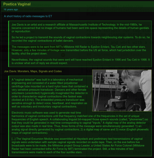 fossilesque@mander.xyzM to Science Memes@mander.xyzEnglish · 5 days ago"Nevertheless, the vaginal sounds that were sent will have reached Epsilon Eridani in 1996 and Tau Ceti in 1998. It is unclear what sort of reply we should expect."mander.xyzimagemessage-square44linkfedilinkarrow-up1191arrow-down13file-text
