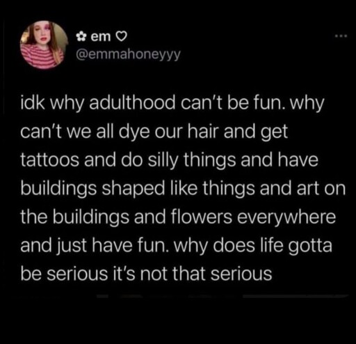 But there’s definitely a cohort of very angry people who will scream at you for dying your hair, getting tattoos, or dressing outside the business casual uniform we’ve been assigned since graduation. “Blue hairs” is practically a slur on the internet. And heaven help you if you’re a woman with a bit of goth-tier flare.