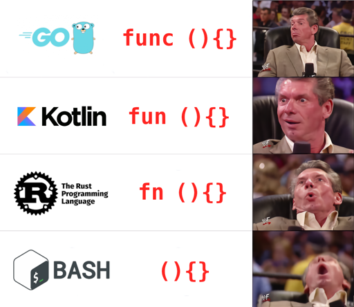 def ():is pretty niceEdit: also as someone doing a bunch of CI work right now, Bash can GTFO (unless the alternative is whatever Windows is doing)