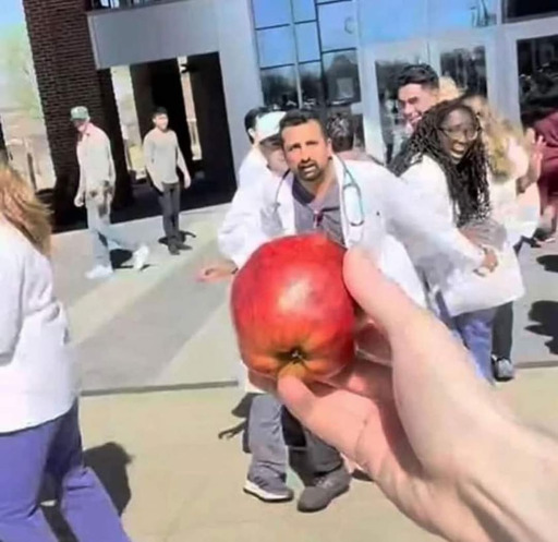 An apple in the hand makes the nurses scared
