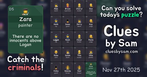 I solved the daily Clues by Sam, Nov 26th 2025 (Medium), in less than 14 minutes 🟩🟩🟩🟩 🟩🟩🟩🟩 🟩🟩🟩🟩 🟩🟩🟩🟩 🟩🟩🟨🟩 https://cluesbysam.com/