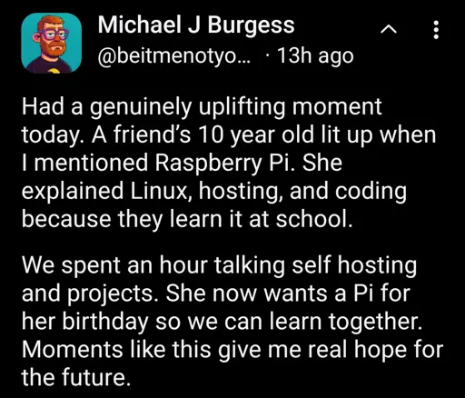 minus-squareSocialism_Everyday@reddthat.comBannedlinkfedilinkEnglisharrow-up12arrow-down2·26 days agoHope for the future = nerds exist?