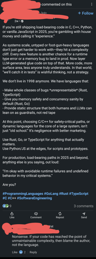 As systems scale, untyped or foot‑gun‑heavy languages don’t just get harder to work with—they hit a complexity cliff. Every new feature is another chance for a runtime type error or a memory bug to land in prod. Now layer LLM‑generated glue code on top of that. More code, more surface area, less anyone truly understands. In that world, “we’ll catch it in tests” is wishful thinking, not a strategy.