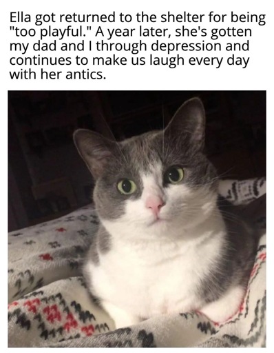 I totally agree that adopting is a big responsibility. Still, personalities don’t always fully come out in the shelter. We adopted a 15 year old to give him a golden basket. We were told he’s calm while withdrawn, while still at ease around other cats. What we got was a 15 year old acting like 2 year old. Absolutely races through the house and wants to play a lot with the other cats to the point they get annoyed, and is constantly and aggressively trying to steal from our plates. Frequently gets the zoomies at four in the morning which can result in facelicking. Still love him ofcourse, but I can imagine it’s harder to deal with if you’re in your 70’s and expected a cat that at least doesn’t try to use your legs as tree trunks on the way to food. Trying to find a family that matches the kitty’s personality doesn’t mean you’re a bad person imo. Throwing them on the street is evil of course.