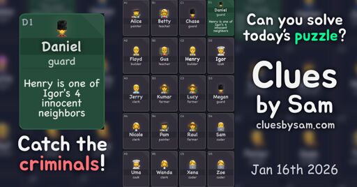 https://cluesbysam.com/#CluesBySam - Jan 13th 2026 (Medium) Less than 7 minutes 🟩🟩🟩🟩 🟩🟩🟩🟩 🟩🟩🟩🟩 🟩🟩🟩🟩 🟩🟩🟩🟩