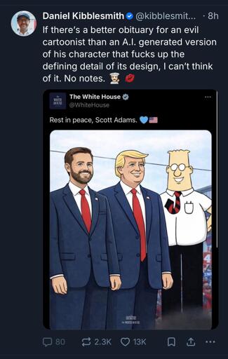 I didn’t realize he had died and saw a few posts about how weird and self-serving he was, on top of the racism. 3 years ago a bunch of papers dropped Dilbert over him going on a racist rant.