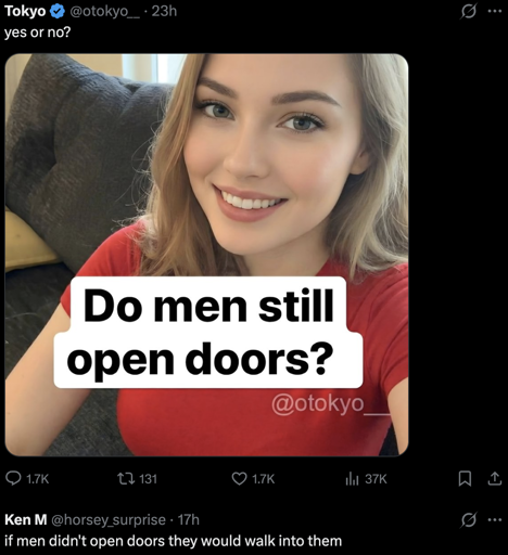 Man here. I haven’t opened a door since 2005. When my wife isn’t with me I just stand outside trying to hide my tears until a woman comes along to let me in.