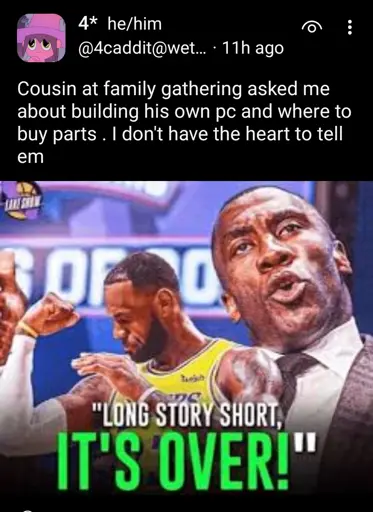 My younger half brother, 13yo, just bought a PC with his own money that he’d saved for years. He gave me a link to one and I told him he can easily get much better specs than that for the same price, and told him I’ll help him get the parts and build it. He told me he would and then about a week ago he told me he’d just bought the one he found at first… I just feel like saying “that was dumb, now you’ll have to spend more sooner to upgrade because it can barely handle the games you wanted it for.” but I won’t, not that harshly at least. Still think he should have just given the money to our mom or his dad so they could have stopped this from happening.