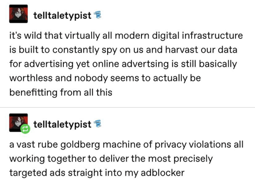 ICE is using Palantir data to target neighborhoods, which is purchased directly from “advertising” data brokers. So “advertising” is only part of the story. It’s always been about creating a surveillance state, it’s just not evenly distributed.