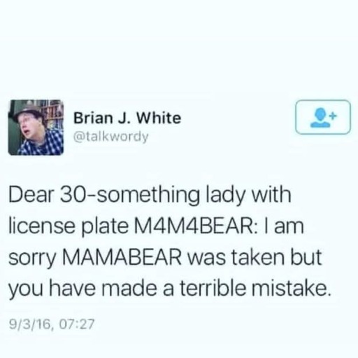 So the license plate can really be interpreted as “Man looking for man (specifically, a bear” or, more juicy, “male looking to arrange a gay threesome with at least one bear” (hmu if this is you)