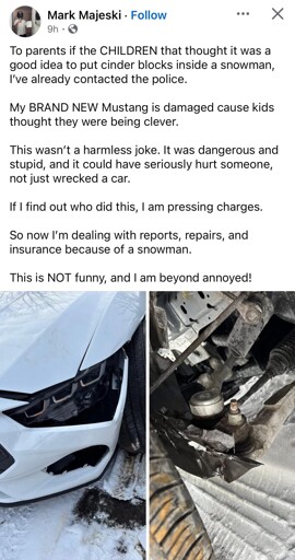Nobody else was hurt. Nobody else’s property was damaged. There is no one to be held liable.This guy drove into a snowman, regardless of where it was.