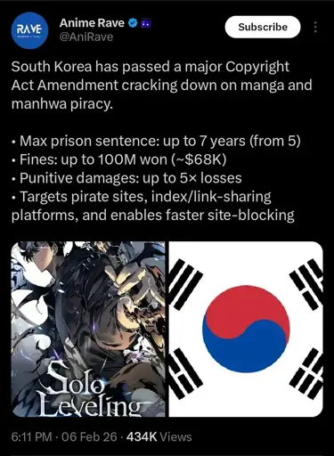 themachinestops@lemmy.dbzer0.com to Piracy: ꜱᴀɪʟ ᴛʜᴇ ʜɪɢʜ ꜱᴇᴀꜱ@lemmy.dbzer0.comEnglish · edit-222 days agoSouth Korea has passed a major Copyright Act Amendment cracking down on manga and manhwa piracy.lemmy.dbzer0.comimagemessage-square44linkfedilinkarrow-up1329arrow-down12file-text