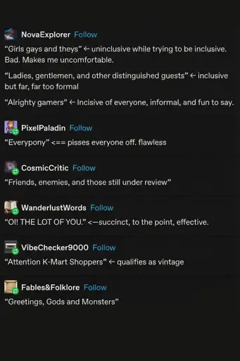 minus-squareMrVilliam@sh.itjust.workslinkfedilinkEnglisharrow-up19arrow-down1·9 days ago“Kings and Queens and In-betweens” “Theydies and gentlethem”