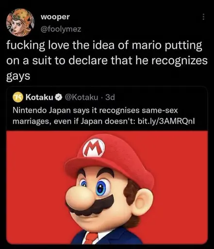 arrow-up1783arrow-down1imagemario recognized gayslemmy.blahaj.zonenot_IO@lemmy.blahaj.zone to Microblog Memes@lemmy.worldEnglish · 4 days agomessage-square61linkfedilink