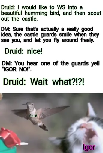 I feel like, related to this meme, cats in particular would be a lot more common, and trained to hunt pests. Sure, most people can’t identify one rat from another, but they can identify cats. The cars kill infiltrators (druid or just pests), and they cut their numbers down so new ones are more obvious. They themselves are known to the guards so they know if some new cat appears.
